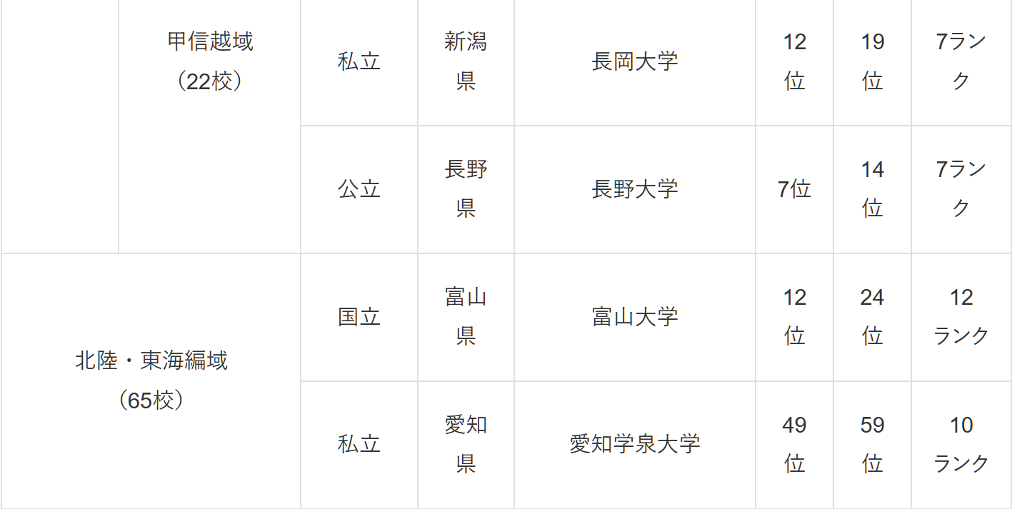 北陸・東海編(65校中の順位)